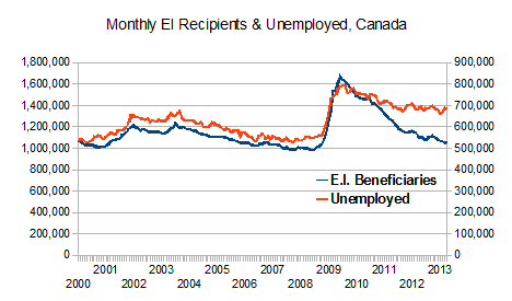 We don’t stress enough that part of the problem here is the duration of benefits.  According to the 2012 EI Monitoring and Assessment report (chart 28), in 2010 / 2011 nearly 30% of regular EI recipients exhausted their benefits, up 5 percentage points from 2009 / 2010. Given that the Extended Employment Insurance Benefits Pilot Project was phased out in September 2012, and the increase in temporary work, this number will likely continue to be significant.