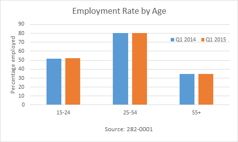 In fact, what we see when we look at employment rates, is that they haven’t budged for any age category. So employment growth in all age groups has only just kept pace with population growth, and not made a dent in our stagnant labour market.